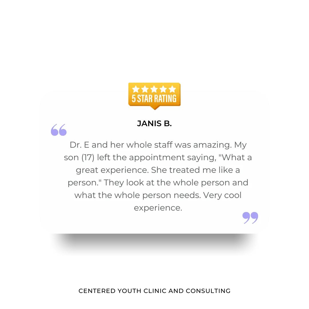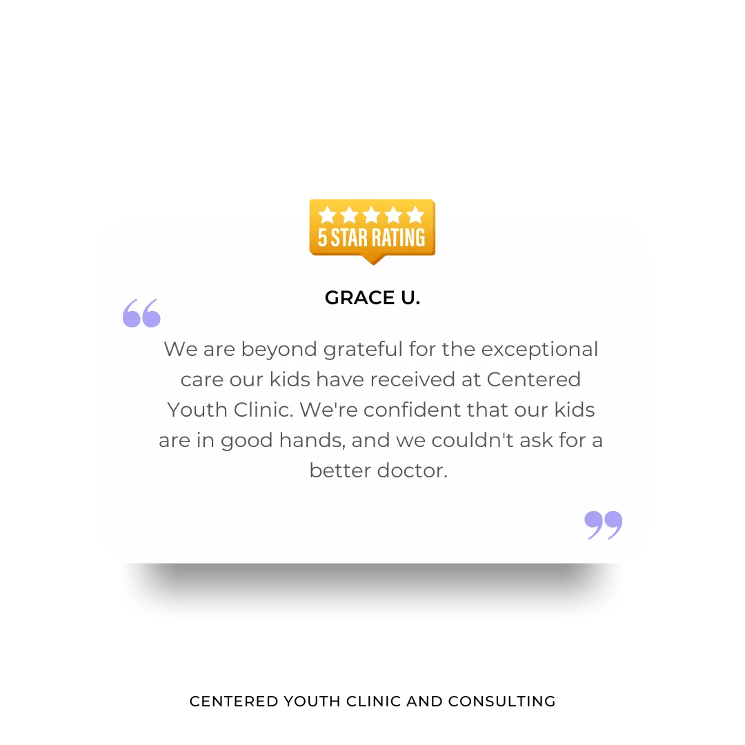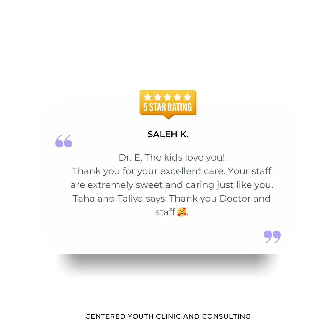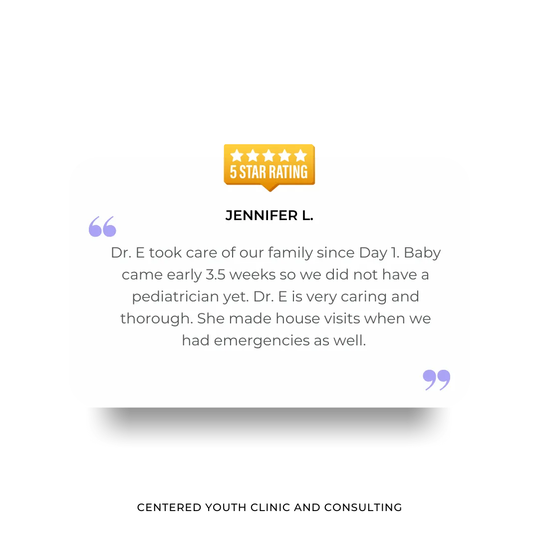 "We are beyond grateful for the exceptional care our kids have received at Centered Youth Clinic, and Dr. E is the reason why! After 19 months of being part of their family, we can confidently say that Dr. E is not just a pediatrician, but a guardian angel for our children." - Grace U.